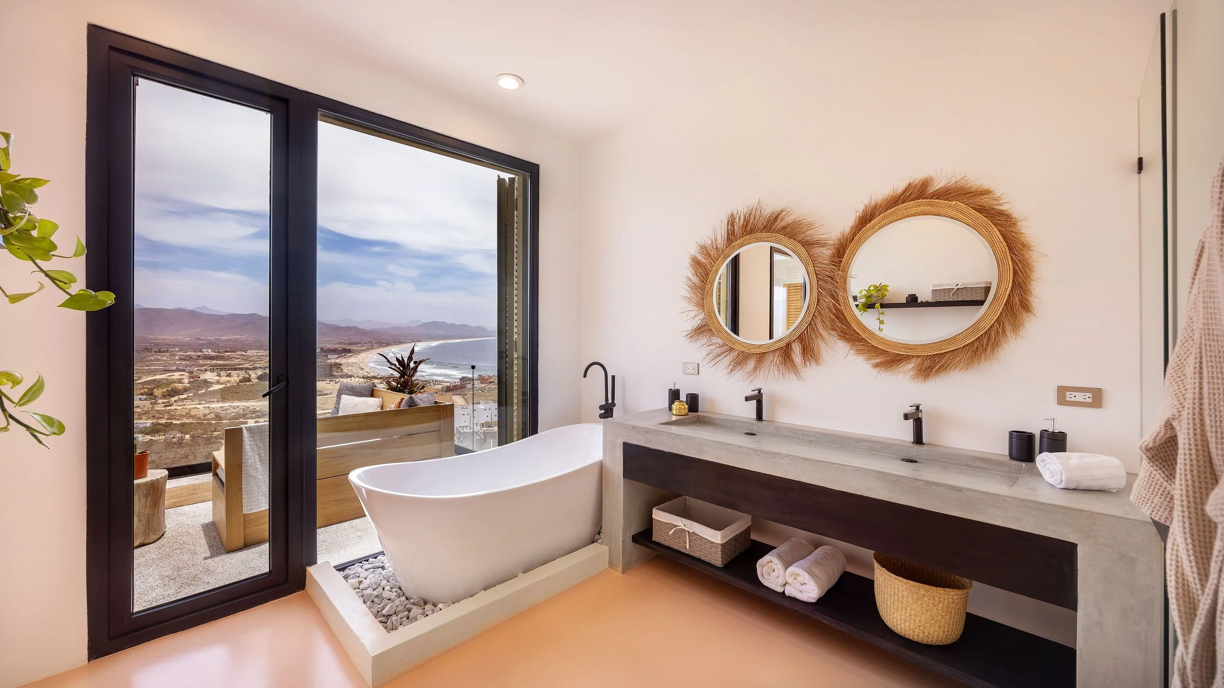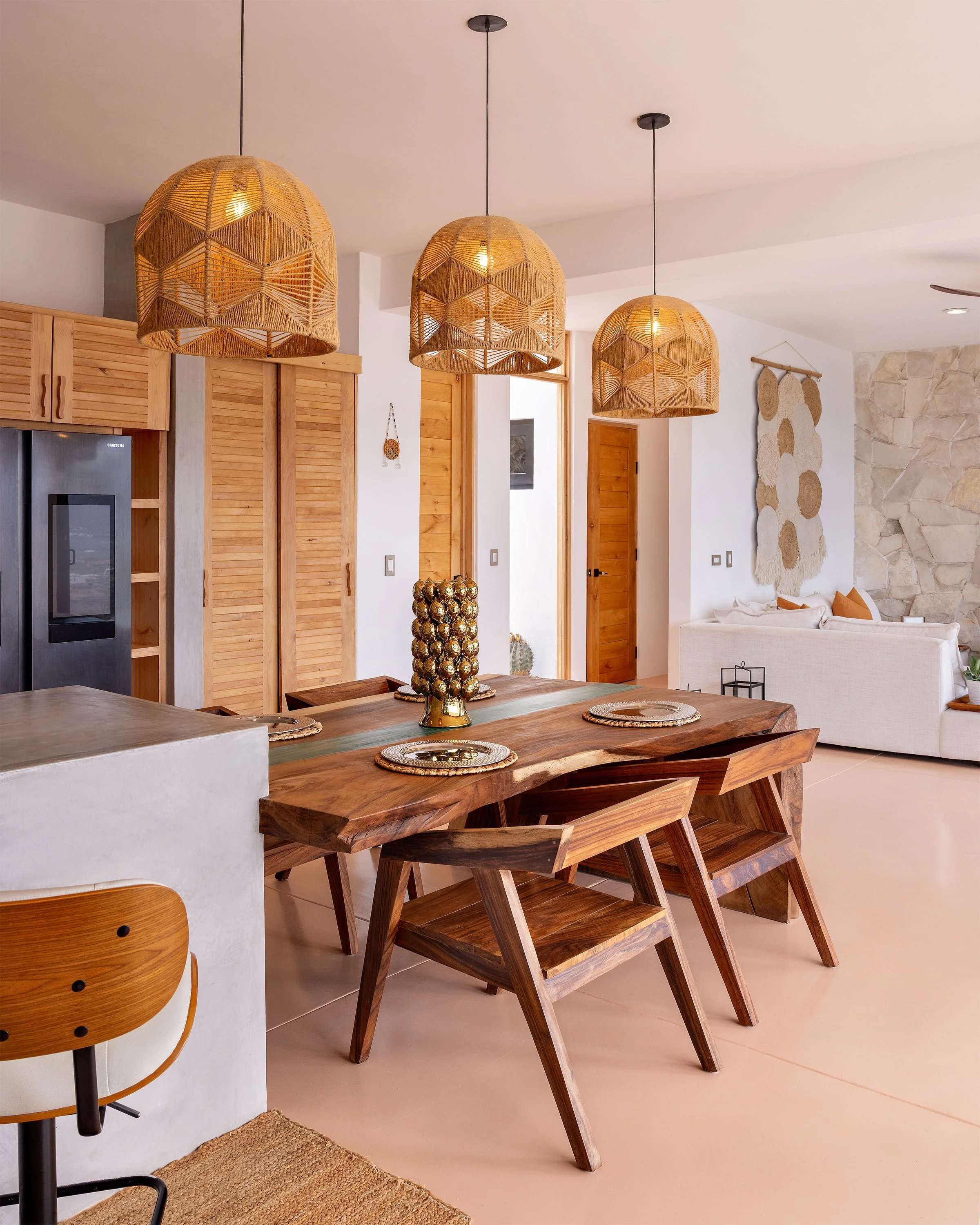 Casa Luna’s architecture reflects a modern Mexican aesthetic: bold lines, natural textures, and locally inspired materials. Polished concrete, custom woodwork, and floor-to-ceiling glass walls create a seamless blend of style and function. Every detail is intentional — from the placement of the windows to the flow of the living spaces — designed to maximize light, views, and connection to the landscape.